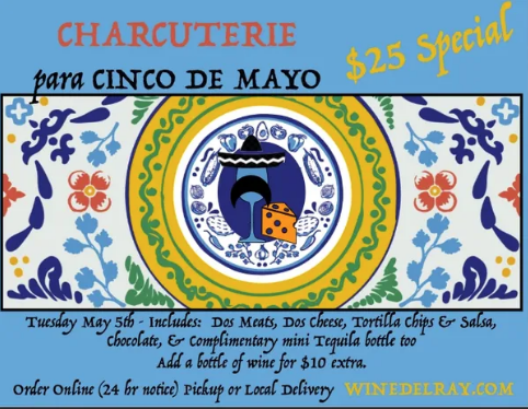 Cinco de Mayo Special: Cinco Charcuterie DIY Special- includes 2 meats, 2 cheeses, Salas and Tortilla strips, a Mexican chocolate for dessert, and a complimentary Jose Cuervo Especial Blue Agave mini Tequila bottle for $25. Add a bottle of Pebble Lane wine (Cabernet, Pinot Noir, Chardonnay or Rose) for $10 dollars extra.