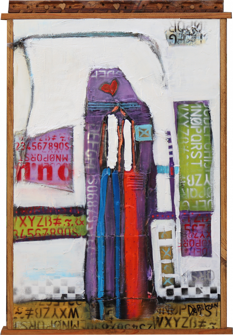 DeBilzan’s abstract compositions spill over into his sculptures, where brightly clothed figures in metal appear to have stepped off his canvas. The elongated abstract figures often stand against a bold background of saturated color. His use of black outline emboldens and highlights the bright primary and secondary palette of his shadow-less world. The abstract figurative elements convey the simplicity of life while the posture, slight tilt of a head and arrangement of an arm elicits deep emotional reflection.